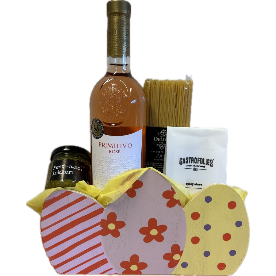 1 fles Italiaanse roséwijn, pakje pasta, potje pesto en een zakje apero snacks