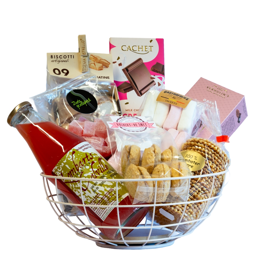 Het Zoete lekkernijen met tuinsap pakket biedt een fles ambachtelijk vruchtensap, gecombineerd met diverse zoetigheden zoals chocolade, koekjes, wafeltjes en marshmallows. Alles mooi verzameld in een mandje, ideaal voor bij de koffie of thee.