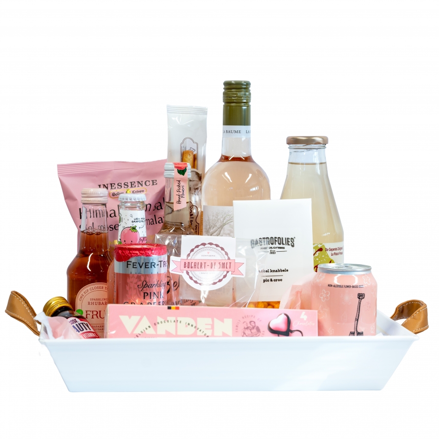 Een compleet en stijlvol alcoholvrij cadeau in een roze met wit thema. Dit ruime pakket bevat een gevarieerde mix van alcoholvrije dranken en sappen, gecombineerd met zowel hartige snacks, knabbels als zoete chocolade. Gepresenteerd in een strakke witte serveerschaal met handvatten, ideaal voor een gevarieerd borrelmoment.