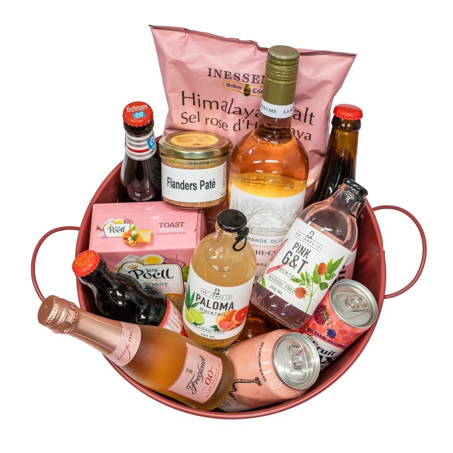Een compleet, 100% alcoholvrij borrelpakket. Deze roze bucket is gevuld met een mix van alcoholvrije dranken zoals bubbels, mocktails en bier, aangevuld met hartige snacks waaronder chips, toastjes en paté.