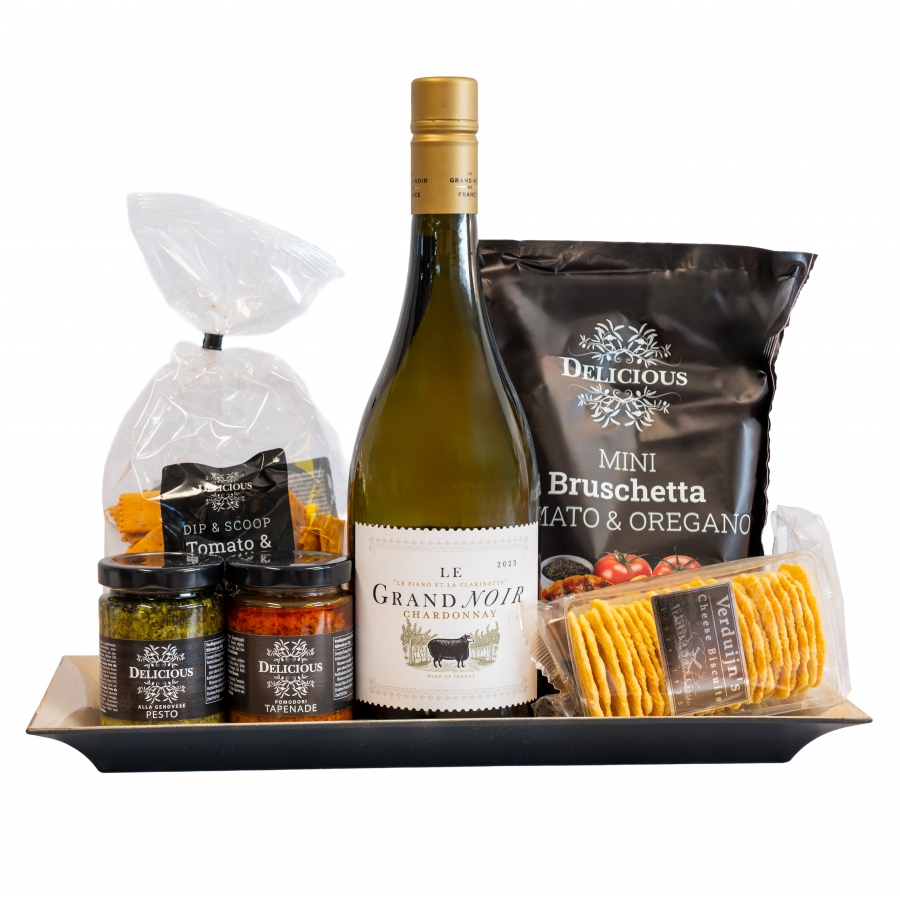 Witte wijn & zuiderse lekkernijen, Le Grand Noir Chardonnay gaat hier hand in hand met mediterrane hapjes. Denk aan krokante Bruschettas, Verduijns cheese biscuits, Dip & Scoop met tomaat en oregano, groene Pesto en Rode tapenade. Een stijlvol geschenk dat uitnodigt tot delen.