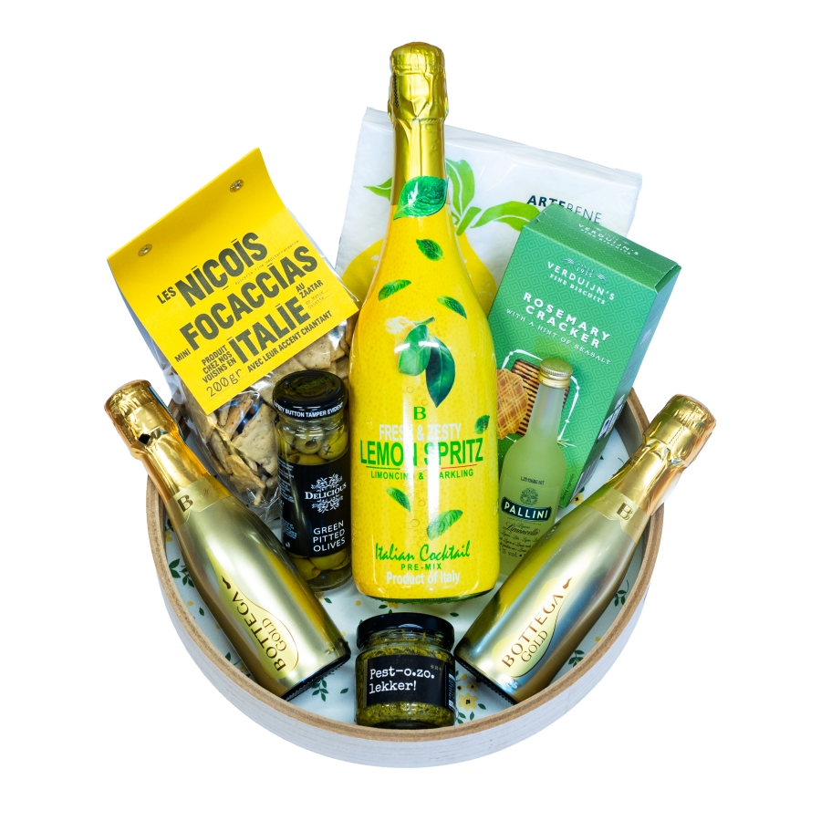 Het Lemonlovers: Limoncello Spritz cadeau bevat de basis voor een frisse cocktail. Samen met de hartige toevoegingen zoals olijven, pesto en ambachtelijke toastjes is de setting direct compleet.
