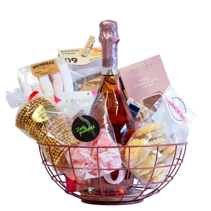 Het Zoete lekkernijen met bubbels 0,0 pakket biedt een fles alcoholvrije bubbels, gecombineerd met diverse zoetigheden zoals chocolade, koekjes, wafeltjes en marshmallows. Alles mooi verzameld in een mandje, ideaal voor een feestelijk moment.